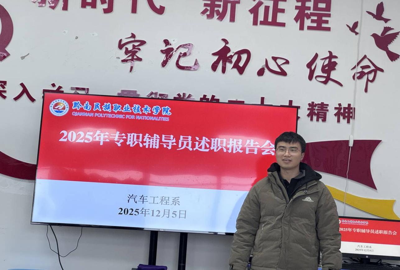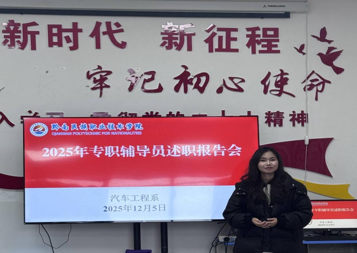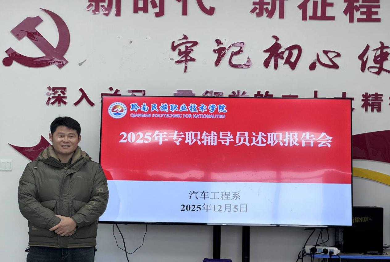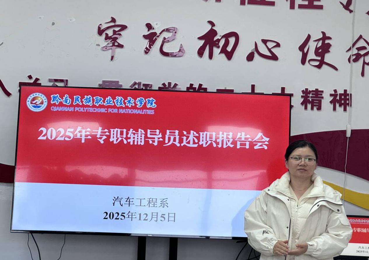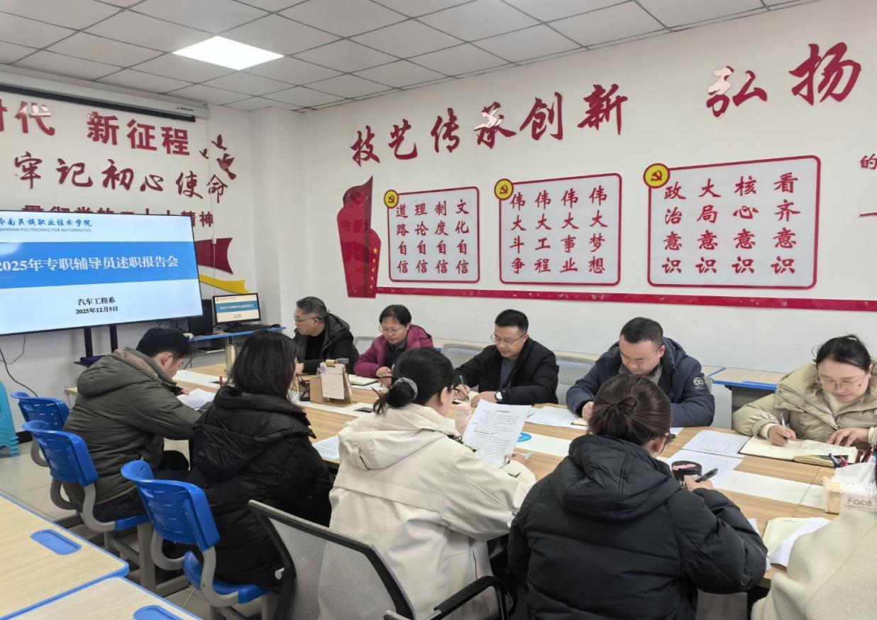 2025年12月5日,汽车工程系在201会议室召开专职辅导员述职会。系党总支书记杨均、副主任蒋可军、教务科主任杨屏及教师兰继红、杜显霞担任评审,韩晓春等七位辅导员述职。辅导员聚焦思政教育、班级管理等核心工作逐一汇报。