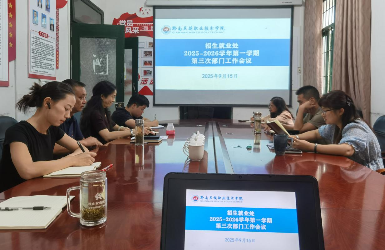 2025年9月15日招生就业处全体教职工在部门会议室召开本学期第三次工作例会。会议传达学习习近平总书记近期重要讲话及上级文件精神,同步传达了贵州省高校综合考核半年评估、高校政治安全机制等文件要求,强调细化责任分工,推动相关任务落地。
