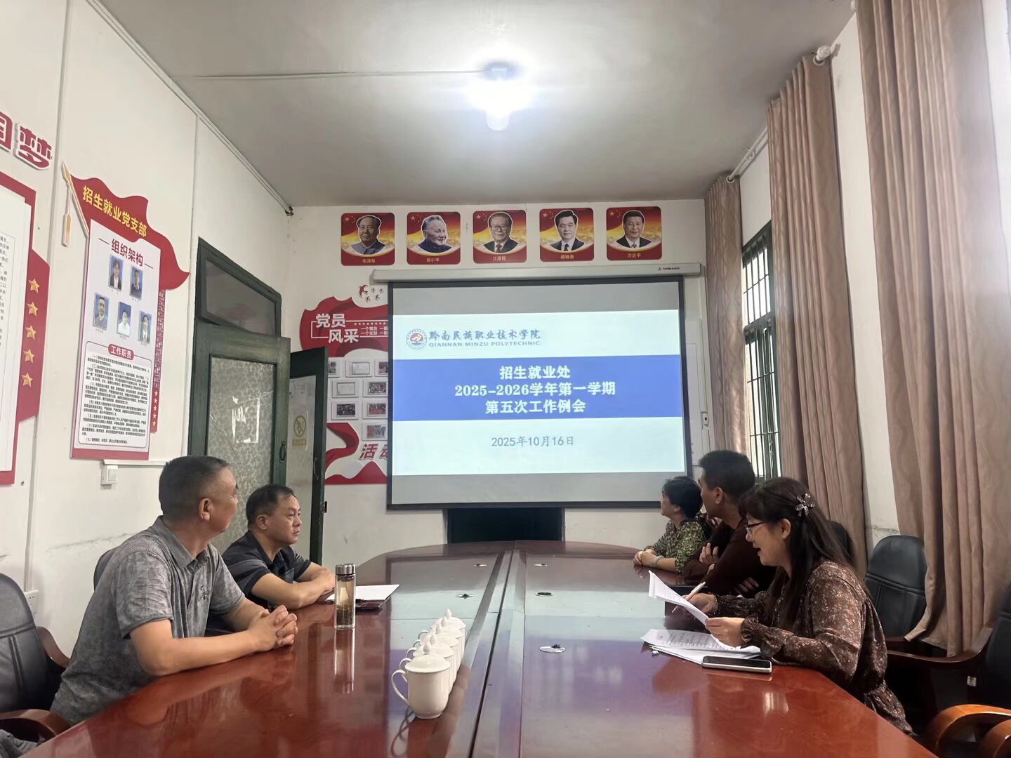 2025年10月16日招生就业处在部门会议室召开本学期第五次工作例会。会议传达学习习近平总书记在中共中央政治局第二十二次集体学习时的重要讲话精神等,研究2026年度用人需求计划,汇报“技能贵州”中高协同发展示范校项目验收及专项资金使用进展。
